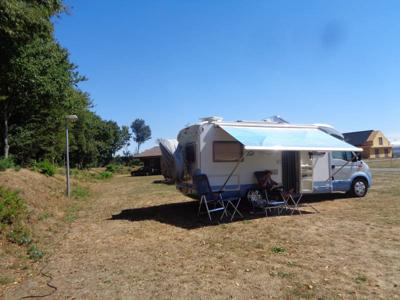 Vanmorgen zijn we tegen 10 uur vertrokken onder zonnige omstandigheden. Het is al maandenlang droog en zonnig en dat is ook te zien aan het landschap wat er bruin en uitgedroogd uitziet. Als je niet beter wist zou je je in zuid Spanje wanen. Ook vandaag dus "Spaanse" temperaturen want we zitten midden in een hittegolf. Onze eerste bestemming, Damme, ligt slechts 188 km van Apeldoorn af en we zijn er dan ook al voor in de middag. De camperplaats ligt niet in het dorp zelf maar bij het kleine vliegveld van Damme. Vanuit de camper kijk je dan ook zo op de startbaan en zie je de vliegtuigjes vlak voor je neus landen en opstijgen, wat wel leuk is. Minder leuk is dat er hier totaal geen schaduw want dat is tijdens een hittegolf niet echt fijn. Nadat de camper op zijn plaats staat gaan we ook meteen in de schaduw van de camper zitten want in de camper zelf of in de zon gaan zitten is bij 34 graden geen optie. Verder gebeurt en op deze dag dan ook nog weinig. Het enige bijzondere van deze dag is het vreemde verzoek van de beheerder later in de avond. Hij vroeg ons om Bincky, ons hondje, even in de camper te doen want hij ging zijn twee bouviers onaangelijnd uit laten op het terrein, het moet toch niet gekker worden. Tegen half twaalf duiken we het bed in om een poging te doen om wat te slapen, ondanks dat alles wat open kan ook open staat is het nog zeer warm in de camper.
