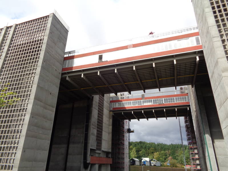 Na een rustige nacht, dus zonder regen of onweer, kon na het ontbijt de stroomkabel weer opgerold worden om vervolgens koers te zetten naar onze volgende bestemming, de stad Schwerin. Voordat we daar zijn maken we al na 8 km een tussenstop bij de scheepslift nabij het plaatsje Scharnebeck. We zetten de camper op de daar aanwezige parkeerplaats neer. Vandaar uit kun je naar het voorlichtingscentrum en de scheepslift lopen. De scheepslift ligt in het Elbe zijkanaal en bestaat in feite uit twee liften, er kunnen dus twee schepen tegelijk afgehandeld worden. De liften overbruggen een hoogteverschil van 38 meter. We hadden het geluk dat er al een schip in een van de liften lag die uit een bak met water van ongeveer 3,5 m diep bestaat. De bak is verbonden met 240 staalkabels van elk 54 millimeter dik met 224 betonnen contragewichten met elk een gewicht van 26500kg. Dit hele gebeuren wordt aangedreven door 4 elektromotoren die slechts 7 minuten nodig hebben om het binnenvaartschip naar boven te krijgen. Het is echt onvoorstelbaar als je ziet hoe snel dat gaat, echt heel indrukwekkend om te zien.