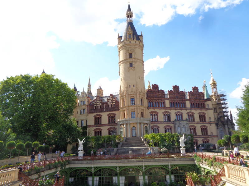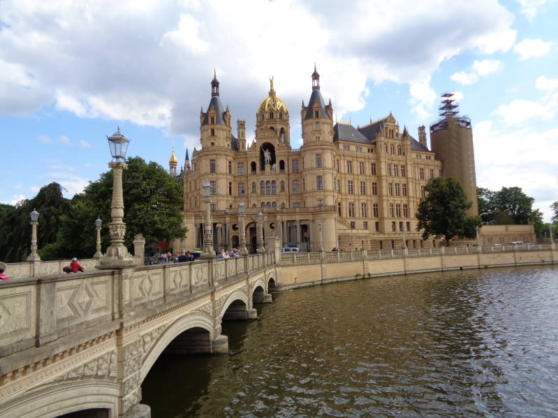 Nadat we dit spektakel live hadden gezien zijn we na een kop koffie doorgereden naar Schwerin waar we de camper op de parkeerplaats voor het Schweriner Schloss zetten. Er staan al behoorlijk wat campers maar gelukkig is er nog net een plekje vrij voor ons. Als we gesetteld zijn lopen we naar het kasteel wat werkelijk een prachtig exemplaar is en eigenlijk ook wel meteen de hoofdattractie is want hoewel het gezellig is in het centrum van Schwerin vinden wij dat het toch moet afleggen tegen Bremen en Lünenburg. Nog even wat feitjes over het kasteel. Het kasteel is in de tweede helft van de 14 eeuw gebouwd en bewoond door de groothertog van Mecklen Schwerin en tussen 1756 en 1837 is het in verval geraakt omdat de toenmalige hertog een ander kasteel betrok. Teruggekeerd werd er in 1837 waarna het kasteel is herbouwd. Na de revolutie van 1918 werd het een museum en vanaf 1952 tot 1981 werd het door de DDR gebruikt als school voor kleuterleiders. Daarna werd het wederom een museum en sinds 1990 is het slot in gebruik genomen door het parlement van Mecklenberg Voor Pommeren. De laatste jaren is men begonnen met het slot te renoveren en ook op het moment dat wij er waren stond het nog gedeeltelijk in de steigers.