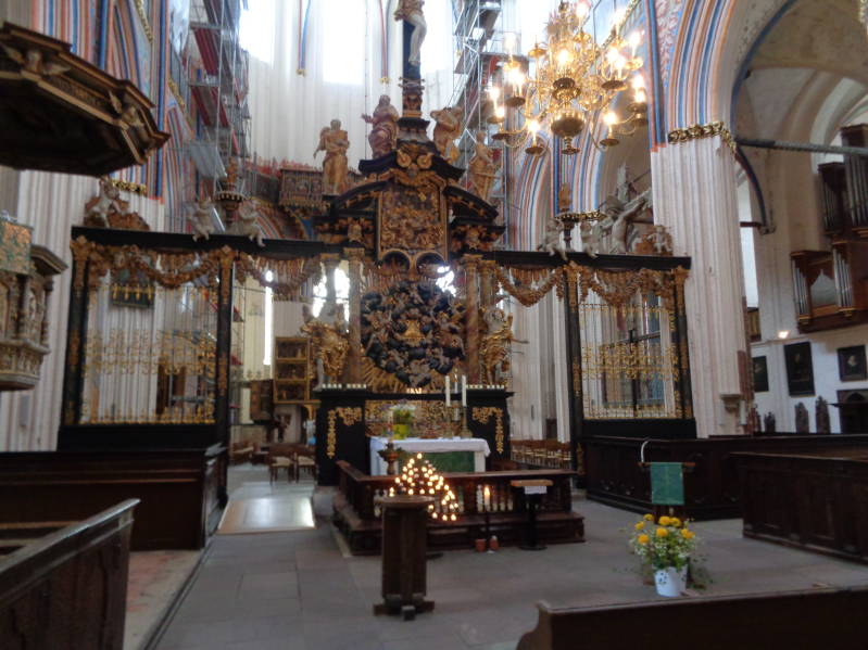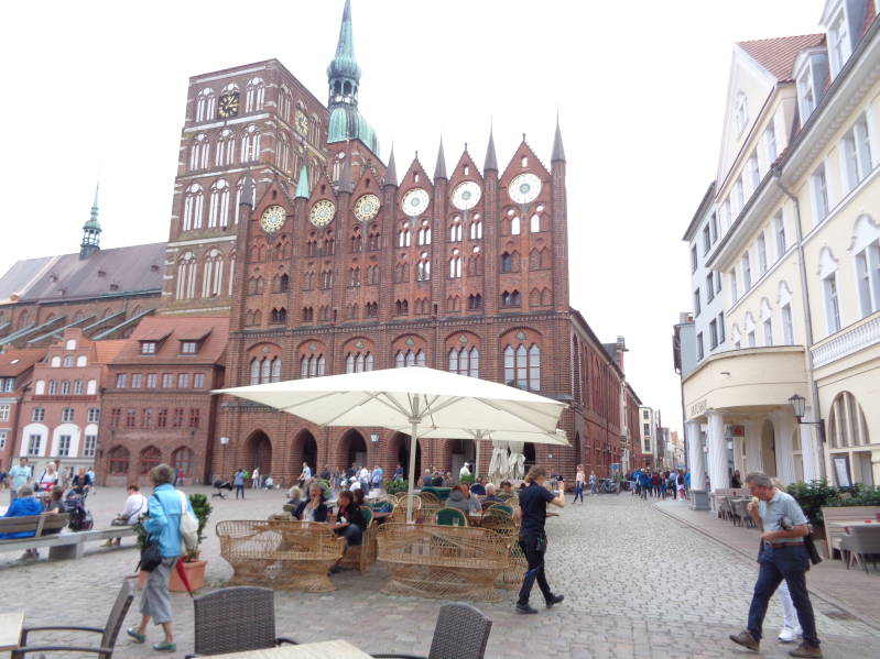 Na een zeer rustige nacht en na het ontbijt en de verzorging van de camper gingen we op weg naar Stralsund, ook een plaats aan de Oostzee en van hier uit kun je via een brug het eiland Rügen oprijden iets wat wij overigs vandaag nog niet gaan doen. Waarom weten we niet maar op de weg is het zeer druk en we schieten dan ook niet echt op en rijden we vaak van de ene file in de andere. De enige verklaring die we er voor kunnen vinden is dat het hier behoorlijk toeristisch is. Dat blijkt ook als we de camperplaats in Stralsund oprijden, die is meer dan vol maar met toestemming van de beheerster mogen op een niet gemarkeerde plaats gaan staan in een mooi hoekje van de camperplaats. Nadat de camper aan de stroompaal zat zijn we het centrum ingelopen waar het gezellig druk was. Stralsund heeft een mooie altstadt en een paar mooie kerken. Daarvan zou de Nikolaikerk de mooiste zijn en na drie euro te hebben betaald hebben we die van binnen bekeken, hij was echter niet zo mooi was als we wel dachten. Vervolgens zijn we naar de sfeervolle haven gelopen waar we met uitzicht op Rügen op een terras zijn gaan zitten voor een kop koffie en appeltaart. Het werd nog een hele strijd met de overvloedig aanwezige wespen om de appeltaart zonder ongelukken naar binnen te werken maar dat lukte ons wonderwel. Tegen half zes waren we weer terug bij de camper waar we de avond in gepaste rust hebben doorgebracht.