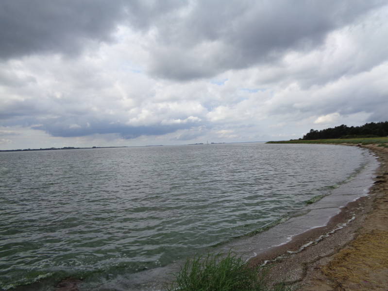 Na een onrustige nacht door de hitte in de camper en een nachtmerrie van mij waarin ik op gruwelijke wijze via het openstaande zijraam van de camper met een mes vermoord werd stonden we toch om half nacht levend en wel weer naast ons bed. Vandaag zouden we doorrijden naar Bremen maar gezien de verwachte temperatuur van 38 graden besloten we dat een dag uit te stellen. Bij het vliegveld blijven staan was met de verwachte hitte ook geen optie en dus besloten we 10 kilometer verder op aan de Dümmersee op een camperplaats te gaan staan waar wel schaduw zou zijn. Bij aankomst bleek dat inderdaad het geval te zijn en zijn we op een mooi plekje onder de bomen gaan staan. Daarna maar eens de omgeving wat verkend en dat zag er wel goed uit. De Dümmersee is best wel een groot meer waar je ook nog eens om heen kan fietsen. Dat laatste besloten we dan ook te doen in de hoop door de rijwind wat afkoeling te krijgen. Daar kregen we spijt van want de hele fietstocht verliep in de brandende zon waarbij de wind niet de verwachte afkoeling gaf want die was ook heel warm. Als we onderweg ook maar iets tegen kwamen wat op schaduw leek stopten we meteen om even wat af te koelen. Al met al hadden we ruim 25 kilometer afgelegd voordat we het rondje meer hadden afgerond en we kletsnat van het zweet aan de buitenkant en uitgedroogd aan de binnenkant weer bij de camper aankwamen. We hebben weer een lesje geleerd, ga nooit vol in de zon fietsen bij een gevoelstemperatuur van 40 graden.