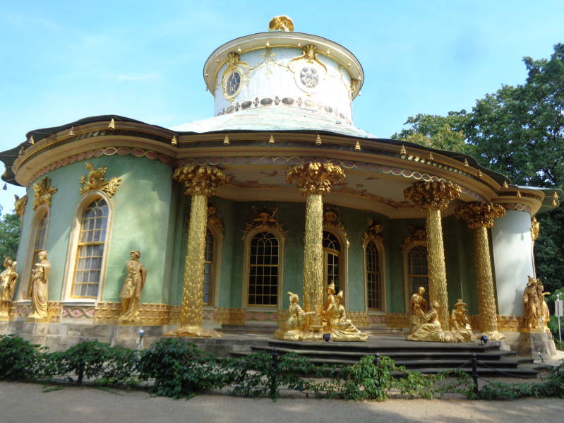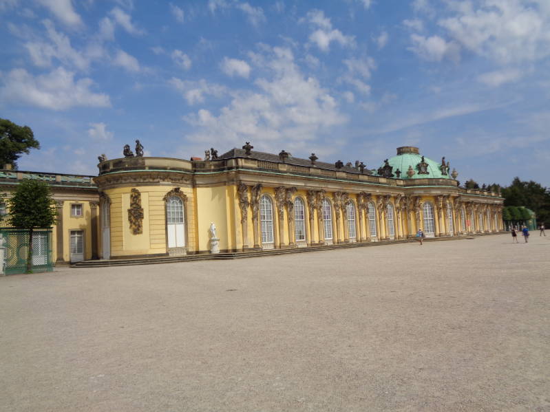 Vandaag rijden we na het vaste ochtendritueel naar Potsdam wat 100km verderop ligt richting het zuiden. Ook vandaag is het rustig op de weg waardoor we lekker kunnen opschieten en zijn we al voor 12 uur op de beoogde camperplaats, een parkeerplaats vlakbij het volkspark in Potsdam. De bedoeling was om daar ook te overnachten maar dat gaat het niet worden omdat er, zo te zien sinds kort, een bord staat dat overnachten met campers verboden is. Overdag mag je er wel staan dus halen we de fietsen van het rek om vervolgens naar het park Sanssouci te fietsen. Het park hadden we al snel gevonden en nadat we de fietsen op slot hadden gezet zijn we het park in gelopen. In het park staan twee paleizen, het oude en het nieuwe paleis. In het nieuwe paleis heeft de laatste keizer, Wilhelm II, gewoond voordat hij werd afgezet en Duitsland vanaf dat moment een republiek werd. Verder zijn er nog een paar mooie gebouwen te bewonderen in het park waarbij wij het Chinese huis, een theehuis uit 1764, eigenlijk wel het mooist vonden. Nadat we alles bekeken hadden zijn we weer terug gegaan naar de camper en meteen de airco aangezet want vandaag was het ook weer tropisch warm. Omdat we hier dus niet mochten overnachten moest er naar een alternatief gezocht worden en dat werd een camping in Ketzin wat niet zo ver van Potsdam af ligt. Helaas bleek deze camping helemaal vol te staan dus moesten we we weer op zoek naar een andere mogelijkheid. Dat werd een camperplaats in Schergow. Om er te komen moest we nog wel eerst met een pontje de rivier Havel oversteken. De camperplaats bestaat uit een stuk weiland achter een restaurant maar is wel voorzien van alle faciliteiten. We staan hier met 3 andere campers dus voor iedereen plaats genoeg. De avond brengen we door met buiten zitten onder het genot van een hapje en drankje.