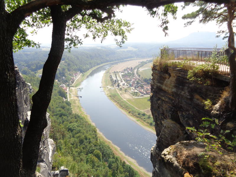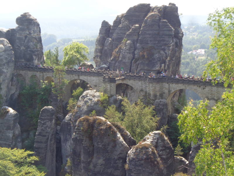 Vandaag verlaten we Dresden alweer want deze reis willen we veel zien en is het niet onze bedoeling om ergens langer dan een dag te blijven. Wel proberen we afstanden zo kort mogelijk te houden en daar slagen we, net als gisteren, uitstekend in want ons volgende doel zijn de Bastei rotsformaties die slechts 30 km van Dresden afliggen. Het is dan ook nog maar half elf als we de camper op de Bastei park and ride neer zetten. Van hieruit kun je met de pendelbus naar de rotsformaties een paar kilometer verderop maar wij kiezen er voor om, met Bincky in de hondenbuggy, lopend te gaan. De Bastei rotsformatie is ruim 300 m hoog en al 200 jaar de drukst bezochte attractie in het Nationaalpark Sächsische Schweiz en dat zou zo maar kunnen zijn want in de tijd dat wij er waren struikelde je bijna over de Chinezen en Japanners. Desondanks is de Bastei een prachtig stukje natuur en vanaf het uitzichtplateau heb je een formidabel uitzicht op het Elbe-dal. Daarnaast is ook de BasteiBrücke een bezienswaardigheid. De brug is 76,5 m lang en verbind het kasteel van Neurathen met de Bastei en is gebouwd in 1850. Om er te komen moet je wel over wat conditie beschikken want het gaat trapje op en trapje af. Nadat we alles bewonderd hadden hebben we ons eerst bij een klein eethuisje te goed gedaan aan een broodje braadworst om daarna naar de Swedenkloof te wandelen, als we er zijn kun je via heel veel trappen de kloof doorlopen. Dat wordt wat lastig voor ons omdat het niet te doen is met Bincky in de buggy. Wij lopen dan ook een stukje terug om vervolgen weer bij een van de vele uitzichtplateaus uit te komen. Daarna lopen we weer terug naar het eethuisje en trakteren we ons zelf op een heerlijke sorbet om vervolgens de terugtocht aan te vangen naar de camper. We besluiten hier ook te overnachten mede omdat er een paar campers meer staan die hetzelfde gaan doen.