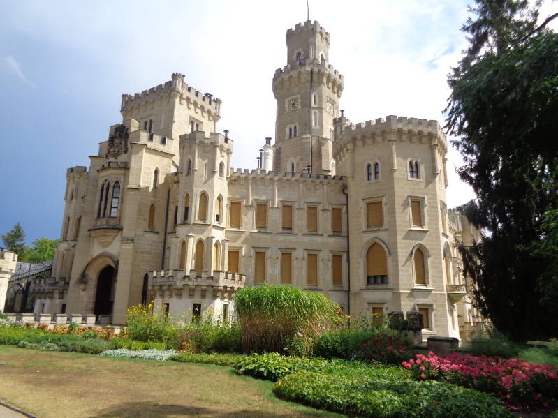 De afgelopen nacht hebben we slecht geslapen want midden in de nacht begon het hard te onweren en de regen kletterde op het dak van de camper. Onweer betekend ook een bange Bincky en die lag dan ook te trillen als een rietje. Maar goed, ondanks dat alles stonden we weer om half acht naast ons bed voor wat betreft het weer een broeierige en wisselvallige dag zou worden. Vandaag waren we van plan om twee plaatsen te bezoeken dus na het ontbijt verlieten we de camping en omstreeks half twee waren we in Hluboká nat Vitavou waar een heel mooi kasteel zou staan. Op de parkeerplaats konden we meteen aan de koffie want er barstte op dat moment een enorme onweersbui los. Toen die overgedreven was scheen de zon er weer vrolijk op los en konden we op pad. Eenmaal bij het kasteel aangekomen bleek dat we er niet voor niets er naar toe waren gereden want het zag er prachtig uit. Mij deed het een beetje aan Winsor Castle denken. Het kasteel is regelmatig verbouwd en tussen 1840 en 1871 is het kasteel ontstaan in zijn huidige vorm.
