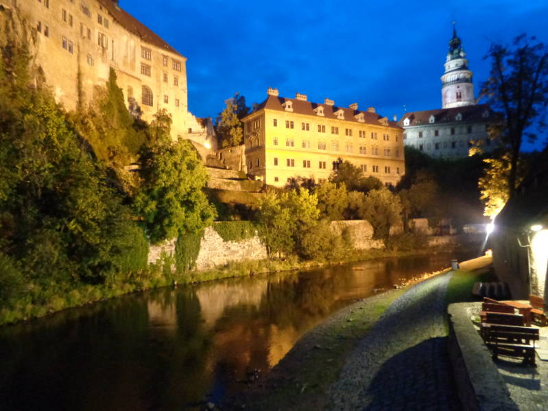 Nadat we weer bij de camper terug waren zijn we doorgereden naar Ceký Krumlov onze laatste overnachtingsplaats in Tsjechie. We komen daar pas tegen 16 uur aan en hebben geen moeite om de camperplaats te vinden die zich bij de busstop bevindt. Nadat we bij de parkeerwacht het overnachtingstarief hebben betaald zetten we onze camper naast de reeds aanwezige campers. Omdat het al achter in de middag is besluiten we om pas na het avondeten het stadje in te lopen. Dat Ceský Krumlov erg toeristisch is kunnen we zien we aan de nu voor ons liggende busstop waar de bussen af en aan rijden. In het begin van de avond lopen wij ook het centrum is wat een kwestie is van de weg oversteken, door een parkje lopen en dan ben je er al. Als we door het centrum lopen zijn we het al snel met elkaar eens, dit is een pareltje en meteen met afstand ook het mooiste stadje wat we in Tsjechië bezocht hebben. We dwalen er uren door heen en genieten van al het moois wat dit plaatsje te bieden heeft. Tegen tien uur en nadat we de gebouwen ook mooi in het licht hebben zien staan zoeken we moe maar voldaan de camper weer op. Morgen en overmorgen hebben we twee reisdagen voor de boeg want we willen deze vakantie afsluiten in de Harz.