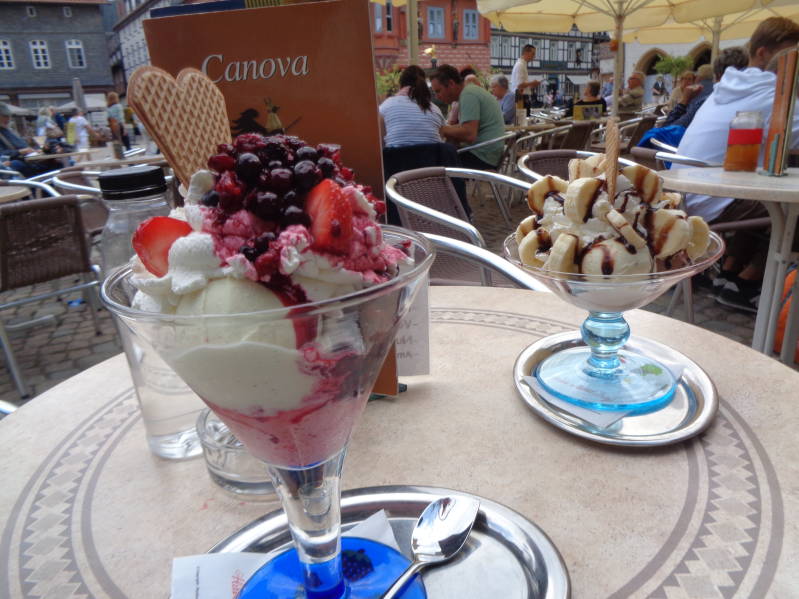 Vandaag maken we weer een mooie rit door de Harz om uiteindelijk terecht te komen in Goslar welke stad we ook willen bezoeken. We zetten de camper op de parkeerplaats waar speciale plaatsen gereserveerd zijn voor campers maar op de meesten staan gewone auto's wat natuurlijk niet de bedoeling is maar wat we wel eens vaker tegenkomen. Gelukkig vinden we nog een plekje op deze overvolle plaats en lopen we de stad in. Goslar heeft ook een altstad met veel vakwerkhuizen en een heel gezellig centrum. We slenteren daar wat rond en omdat het heerlijk weer is zoeken we een terras op en bestellen we een lekkere coupe ijs. Ze zien er prachtig uit en smaken ook goed. Helaas vinden de aanwezige wespen dat ook en vooral vrouwlief moet het ontgelden, ze heeft de grootste moeite om de wespen weg te houden van haar ijs. Gelukkig loopt het goed af en komen we er zonder steken van af. We lopen daarna nog een tijdje door Goslar waarbij we het met elkaar eens zijn dat Quedlinburg toch wel een stuk mooier is dan Goslar. Als we bij de camper terug zijn besluiten we een andere camperplaats op te zoeken want hier blijven om te overnachten vinden we maar niets. Het word de camperplaats in het bergdorpje Lautenthal wat slechts 17 km verderop ligt. De camperplaats is ruim van opzet, je hebt een mooi uitzicht op het dorp en we stonden er maar met drie camper en dus heerlijk rustig.