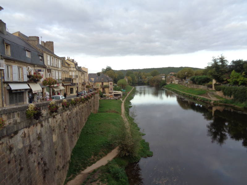 Na enige tijd in La Roque Gageac te hebben doorgebracht zijn we door gereden naar het ook al eeuwen oude vesting stadje Domme wat in tegenstelling van La Roque Gageac hoog op een heuvel is gelegen. Ook hier konden we voor 3 euro de camper weer kwijt op de plaatselijke camperplaats en van daaruit was het maar een klein stukje lopen naar Domme. Het plaatsje wordt geheel omgeven door een vestingsmuur en van daaruit heb je een prachtig uitzicht over de omgeving. Binnen de muren is het heel rustig en lang niet zo toeristisch als in La Roqeu Gageac. Her en der stonden nog wat oude wielrenfietsen want de Tour de France was hier de afgelopen zomer langs gereden. Nadat we hier ook uitgekeken waren zijn we weer terug gereden naar La Bugue waar we de nacht weer doorgebracht hebben.