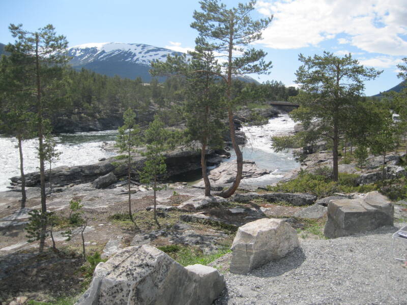 Na het bezichtigen van de kerk vervolgen we onze weg en rijden we nu de Skjakvegen (RV15) op richting Geiranger. Naast de weg zoekt de Otta, een wild stromende rivier zijn eigen weg richting Geiranger. Als we Bismo gepasseerd zijn zien we in Nordberg een mooie camping aan de rivier en we besluiten dan ook spontaan om hier te gaan overnachten. Dat is dus een van de vele voordelen als je met een camper op stap bent, je kunt in feite op elk moment je plannen veranderen. Op camping Donfoss worden we vriendelijk ontvangen en krijgen we een topplek met zicht op de rivier met allemaal stroomversnellingen. Nadat we ons geïnstalleerd hebben gaan we lekker buiten zitten met voor vrouwlief een wijntje en voor mij een lekker koud biertje. Ook besluiten we hier een extra dag te blijven bestaan omdat een rustdag onder deze omstandigheden beslist geen straf is. Wat het weer betreft, we waren begonnen met een onbewolkte hemel maar in de middag met een mix van stapelwolken en zon met een temperatuur van 25 graden.