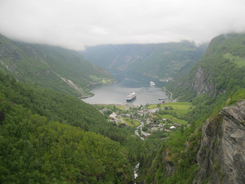 Ondanks dat we er een beetje de pest in hebben door de schade aan de camper vervolgen we onze weg en beginnen we aan de afdaling om uiteindelijk in Geiranger terecht te komen. Onderweg zie we de plaats en het fjord met een paar cruiseschepen al diep onder ons liggen. Als we beneden zijn zien we dat een van de cruiseschepen de Rotterdam is van de Holland Amerika Line. Er lopen dan ook veel Nederlanders rond in Geiranger. Het plaatsje stelt trouwens niet zoveel voor met hoofdzakelijk souvenirwinkeltjes. Wij hebben het dan ook wel na een uurtje gezien en zetten onze reis voort en rijden richting Eidsdal waarbij we meteen weer een flinke klim voor de kiezen krijgen. Boven gekomen zetten we de camper weer even aan de kant want van hieruit hebben we een grandioos uitzicht op het Geirangerfjord. Daarna rijden we naar Eidsdal waar we de veerboot naar Linge nemen en dan FV63 oprijden die ons morgen over de Trollsigen zal brengen. Nadat we Valldal zijn gepasseerd stoppen we bij de Gudbrandsjuvet een heel mooie waterval, daarna gaan we op zoek naar een plek waar we kunnen overnachten. Dat wordt ergens aan de rivier Valldola in de middle of no ware. We staan hier midden in een bos waar een oorverdovende stilte heerst. In Noorwegen geldt het zogenaamde allemansrecht wat inhoudt dat je overal mag overnachten zolang je maar niet te dicht bij bewoonde huizen staat, nu die zijn hier in geen velden en wegen te bekennen dus staan we hier prima. We maken nog een lange wandeling langs de rivier en verduisteren tegen elf uur de camper om vervolgens in alle rust de nacht door te brengen.