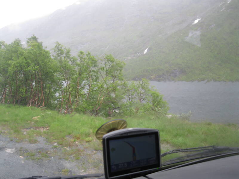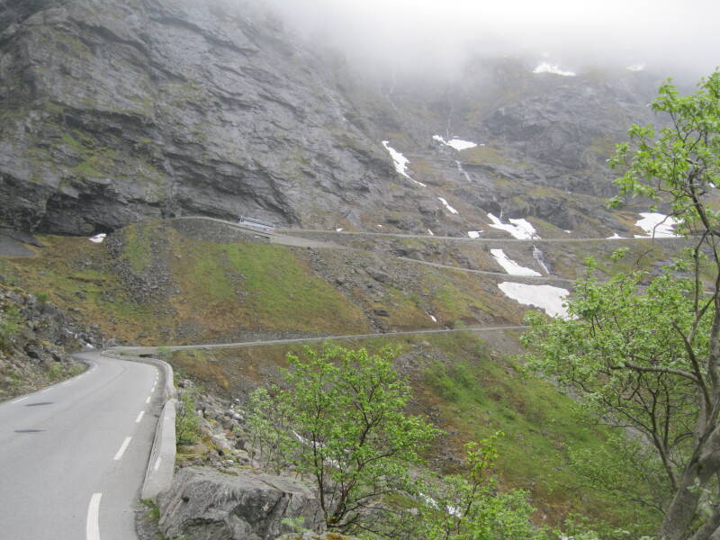 Tegen negen uur zijn we weer op de been na een zeer rustige nacht. Het is vandaag bewolkt maar wel droog. Tegen 10 uur vervolgen we onze weg die nog steeds bergopwaarts gaat. Als we bijna boven zijn rijden we weer tussen hoge sneeuwmuren en is het inmiddels zeer mistig geworden. Boven op de berg aangekomen is de mist wel erg dik. De trollstigen is 20km lang en heeft 11 haarspeldbochten en van bovenaf heb je een spectaculair uitzicht op de weg. Wij dalen het eerste stuk af door de mist en we zijn nog maar net aan de afdaling begonnen als er plotseling een touringcar uit de mist opduikt. Die stopt gelukkig meteen en rijdt een stukje naar achteren om zodoende ruimte voor ons te maken. Het zal niet de enige auto zijn die ons tegemoet zal komen. Gelukkig rijden we al snel de mist uit en krijgen we een goed zicht op de Trollsigen. Diep onder ons zien we tegenliggers zich moeizaam de weg naar boven op rijden. Voor ons is het nu gemakkelijk om bijtijds aan de kant te gaan om elkaar te kunnen passeren want we zien ze al ruim van te voren aankomen. Het is een fantastisch gezicht om de weg met al zijn haarspeldbochten als het ware tegen de berg aangeplakt te zien liggen. Zonder ongelukken komen uiteindelijk onder aan de berg aan en kunnen we weer opgelucht adem halen want het was een spannende afdaling.