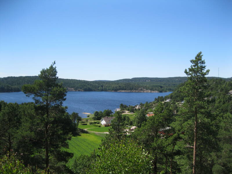 Vandaag gaan we we onder mooie weersomstandigheden richting de Noors/Zweedse grens om op ons gemak huiswaarts te rijden. Maar nu eerst maar eens Oslo uit te zien komen. Dat gaat echter gemakkelijker dan gedacht, gewoon een kwestie van de borden richting E6 volgen. Als we de stad uit zijn volgen we de borden Lillestrom om daarna de RV22 op te draaien. Deze weg zullen we tot aan de grens met Zweden blijven volgen. Vandaag zullen we de grens echter nog niet bereiken want als we onderweg bij een supermarkt wat boodschappen doen merken we dat het toch wel heel erg mooi weer is geworden. We besluiten dan ook bij de eerste de beste camping te stoppen om daar de middag en de avond door te brengen. Het wordt een camping vlak bij het plaatsje Trögstad. Als we er aankomen is er niemand in de receptie aanwezig en dus zijn we zo vrij om zelf een plekje uit te zoeken. Daarna zitten we binnen 10 minuten op onze campingstoelen met een koel drankje lekker in de zon. Ook in de avond zitten we nog lang buiten en kunnen dus zo lekker lang genieten van onze laatste dag in Noorwegen.