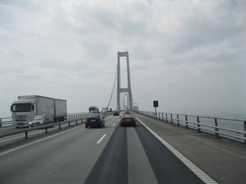 Rijdend op de Oresuntbrug zie je in de verte de Storebeltbrug liggen.