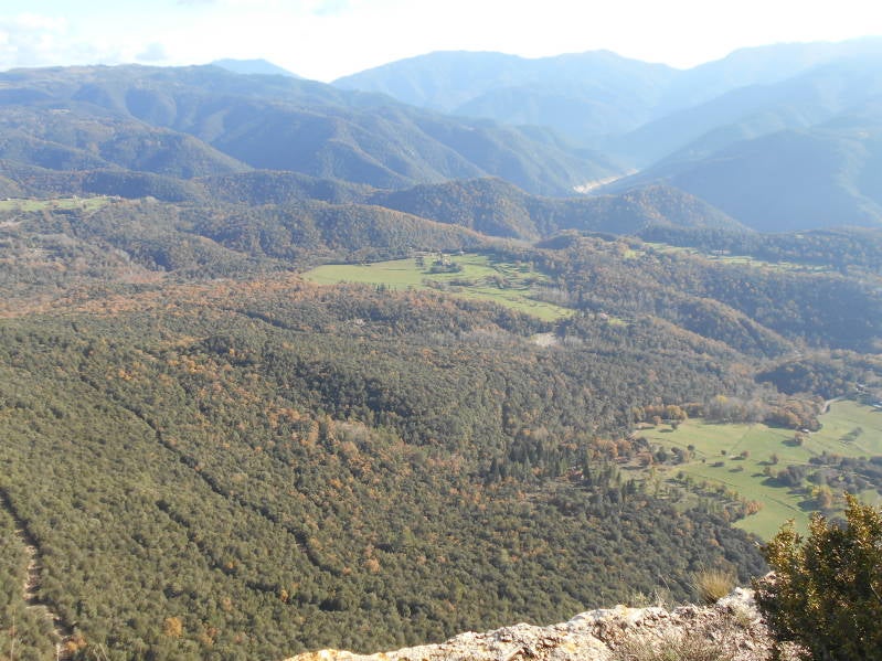 Terwijl de vallei nog geheel in wolken was verborgen hadden wij al een stralende blauwe hemel in het hooggebergte. Vandaag gingen we weer een stukje richting de kust dus werd na het ontbijt de camper verzorgt en na nog een kopje koffie kon de rit beginnen. Het eerste doel was het stuwmeer welke we via een spectaculaire afdaling bereikten. Gelukkig was de bewolking hier inmiddels ook opgetrokken en vanuit het stuwmeer kon je het rotsplateau zien liggen waar we net vandaan kwamen. Na een korte wandeling zijn we verder gereden naar ons einddoel van deze dag namelijk de plaats Granollers. Dat ging nog niet zo eenvoudig maar na het nodige draaien en keren vonden we toch uiteindelijk de camperplaats welke vlak bij parkje lag. Ook dit keer stonden we weer niet alleen want er stond al een Nederlandse camper. Van Granollers zelf hebben we niets gezien maar dat was ook niet de bedoeling. We brachten hier alleen maar de nacht door om morgenvroeg snel in Barcelona te kunnen zijn wat slechts 30 km verderop ligt. Hieronder nog een foto van het stuwmeer en het rotsplateau maar dan vanuit de vallei gezien.