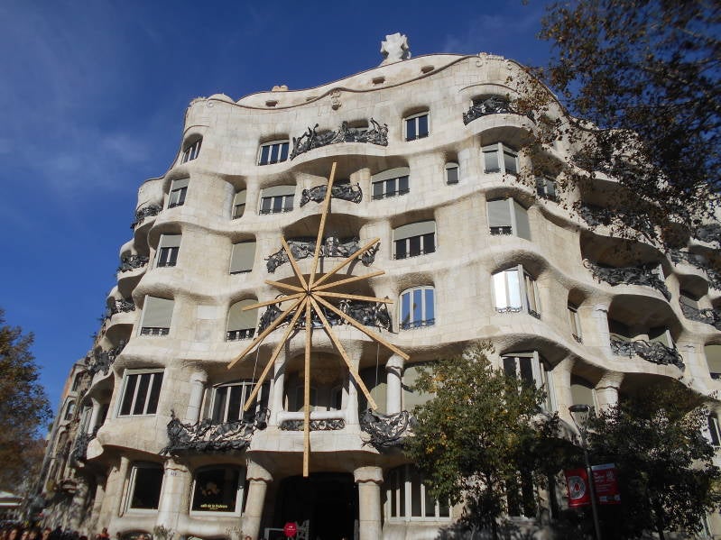 In het centrum hebben we de fiets bij Casa Mila gestald. Casa Mila is ook een creatie van Gaudi. Hoewel we niet echt Gaudi kenners zijn is het ook voor ons duidelijk te zien wat een Gaudi gebouw is en wat niet. Van hieruit zijn we verder lopend gegaan. Om op de Ramblas terecht was het gewoon een kwestie van met de mensenstroom meelopen want wat was het ontzettend druk in Barcelona. Je kon bij wijze van spreken wel over de koppen lopen en dat op een doordeweekse dag buiten het hoogseizoen. Dat massatoerisme is niet echt ons ding maar het was niet anders. We hebben desondanks toch urenlang rondgezworven in het centrum waarbij we het natuurlijk ook niet konden laten om op een terrasje onder het genot van een cappuccino en een bocodilla te kijken naar alles wat aan ons voorbij trok. Op het eind van de middag hebben we de fietsen weer opgezocht en vonden we zonder al te veel moeite de camperplaats weer terug waar we de rest van de dag en avond moe maar voldaan in de camper hebben doorgebracht. Hieronder nog een impressie van Barcelona.