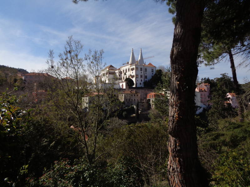 Na een rustige nacht op de mooie camperplaats trekken we weer verder noordwaarts en wel naar de kustplaats Ericeira wat echter Santa Susana zou worden maar daarover later meer. Onderweg willen we ook nog een tussenstop maken in Sintra wat een mooie maar ook zeer toeristische plaats moet zijn. Eerst gaan we echter de camper verzorgen en ontbijten. Dan wordt nog even de de te rijden route doorgenomen want we willen niet op een van de vele tolwegen rondom Lissabon terecht komen. Om niet teveel om te moeten rijden moeten we ook een stuk door Lissabon en dat verloopt allemaal wondergoed. Lissabon bezoeken doen we niet, dat hebben we tijdens een van onze andere reizen al gedaan. We rijden de Ponte 25 de abril over en volgen dan de N6 die pal langs de rivier de Taag loopt en rijden door Estoril en Cascais om uiteindelijk op de N247 terecht te komen. Dat is een heel mooie kustweg maar soms wel erg smal en één keer moest Ria zelfs de buitenspiegel inklappen om een tegenligger te kunnen passeren. Tegen 13 uur komen we ongeschonden aan op een parkeerplaats in Sintra en gaan we het stadje verkennen wat met name bekend is om zijn kastelen en waar het inderdaad erg druk is. We dwalen er tot 16 uur rond en lopen dan weer terug naar de camper om onze reis voort te zetten. We rijden naar Ericeira waar een mooie gedoogplaats moet zijn met zicht op zee. Daar aangekomen blijkt hij vol te staan met personenwagens en moeten we op zoek naar een alternatief. Dat wordt het plaatsje Santa Susana waar we samen met nog een camper op een wat troosteloze camperplaats staan. In de duisternis van de avond zien we in de verte het mooi verlichte Mafra liggen waar we morgen heen willen.