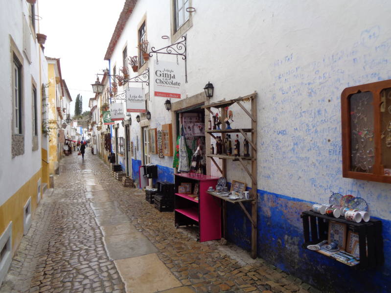 Nadat we weer terug waren in de camper waar een zeer blije Bincky ons opwachtte, zijn we door gereden naar Obidos wat ook een zeer bezienswaardig plaatsje zou zijn. De bedoeling was om daar op de camperplaats te gaan overnachten maar deze pek stond ons niet aan. Inmiddels was het ook gaan regenen maar dat hield ons niet tegen om gewapend met paraplu het stadje in te lopen. Ondanks het natte weer was het gezellig druk in de steegjes met allerhande leuke winkeltjes. Ook de plaatselijke kerk was het bekijken meer dan waard. Nadat we alles hadden gezien zijn we terug gegaan naar de camper en hebben we NKC app geraadpleegd voor een andere camperplaats waarna we besloten om een stukje terug te rijden om op de camperplaats in Penische te gaan staan. het is een camperplaats met alle faciliteiten en dus ook met een stroomaansluiting waardoor we de avond behaaglijk in de warmte van ons elektrische kacheltje doorbrachten .